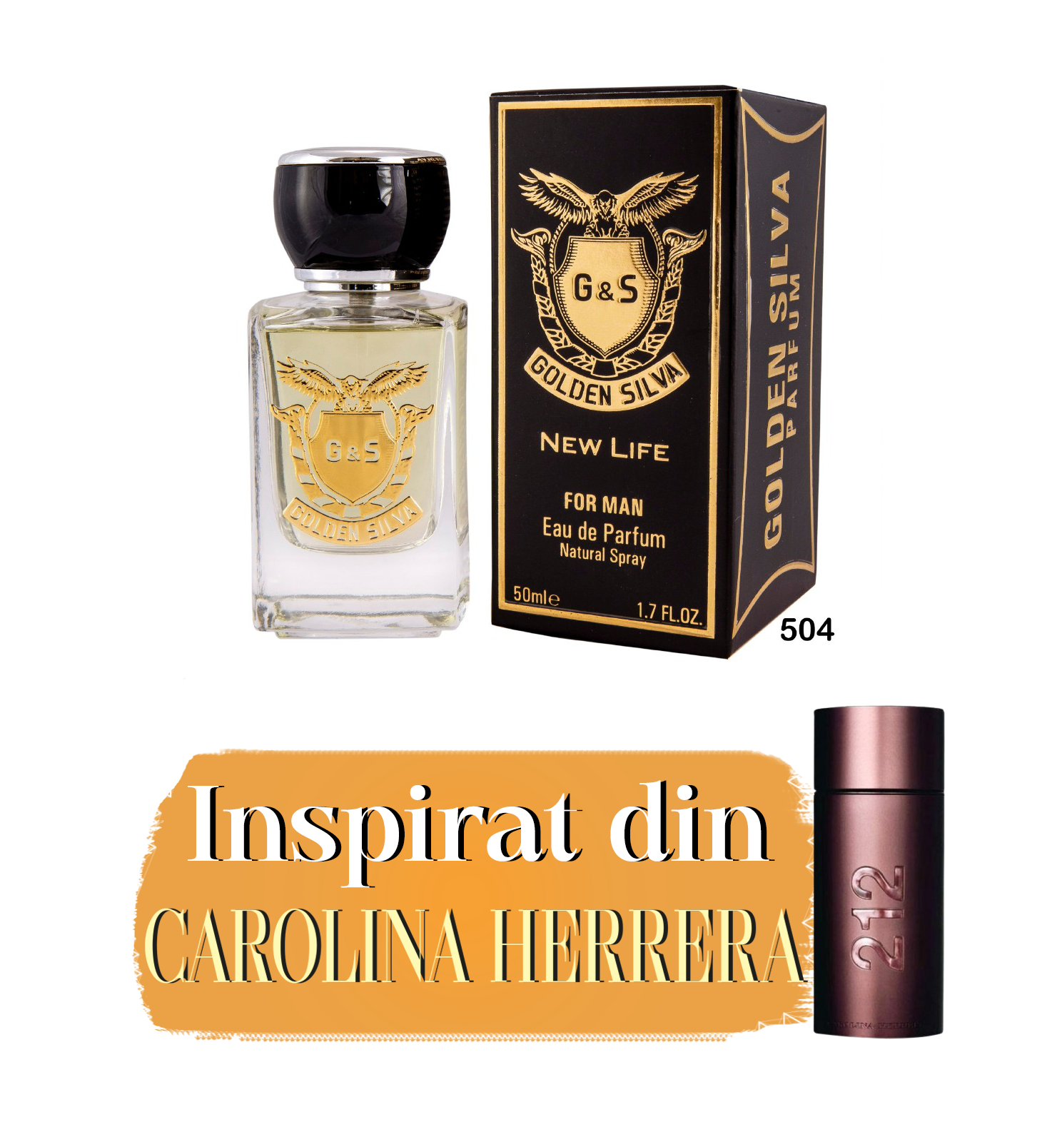 Golden Silva M504 inspirat de Carolina Herrera CH212 Sexy Men este un parfum Ambra Fougere de barbati. Notele de varf sunt mandarina, bergamot si note verzi; notele de mijloc sunt piper, flori si cardamom; Notele de baza sunt vanilie, lemn de guaiac, lemn de santal, mosc si ambra.