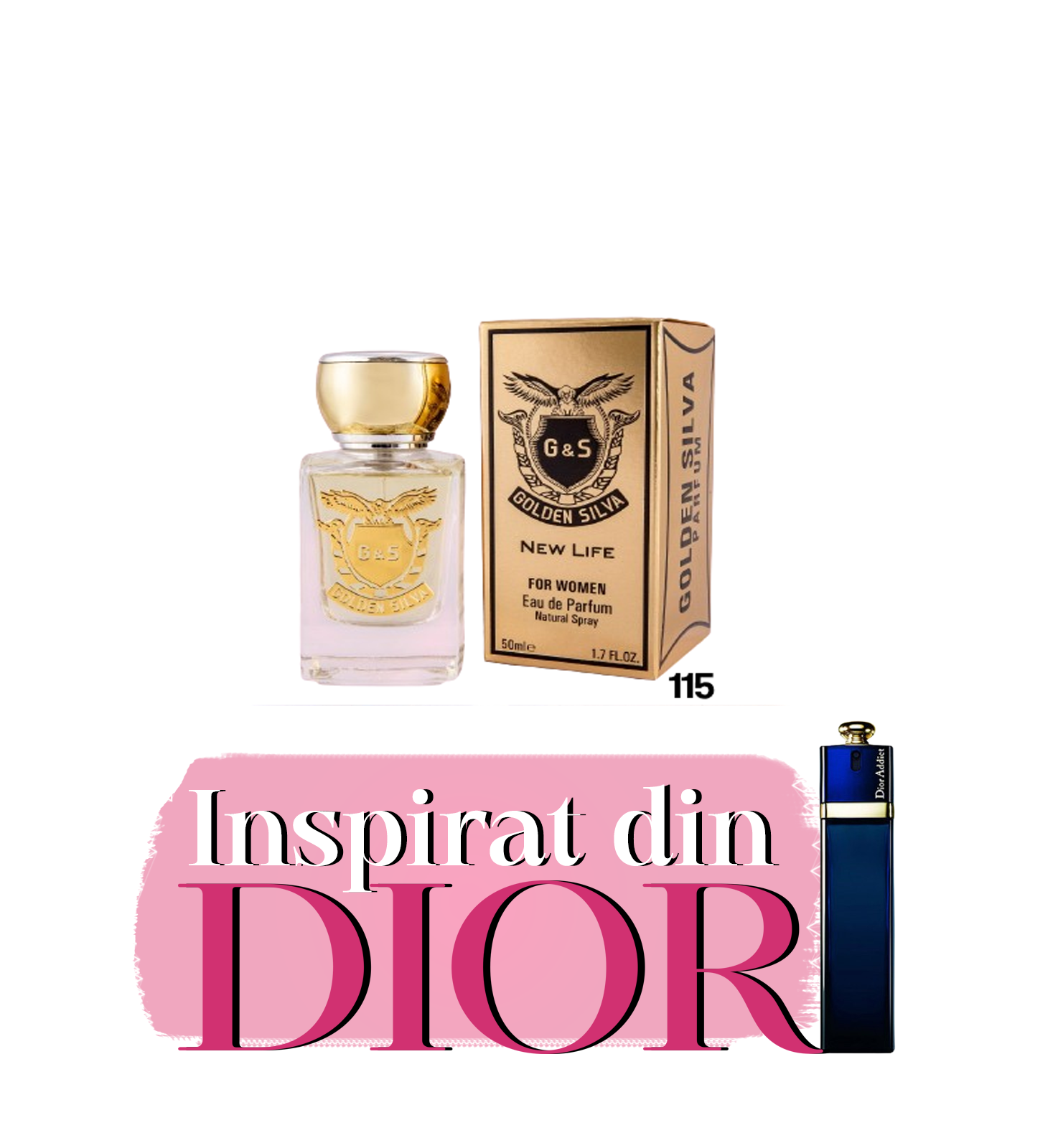 Golden Silva W115 inspirat de Christian Dior Addict, este un parfum Ambra Floral de dama. Notele de varf sunt mure, frunze de mandarin si frunze de arbore de matase; notele de mijloc sunt iasomie, Cereus inflorit noaptea, floare de portocal si trandafir; Notele de baza sunt vanilie, boabe de tonka si Lemn de santal Mysore.