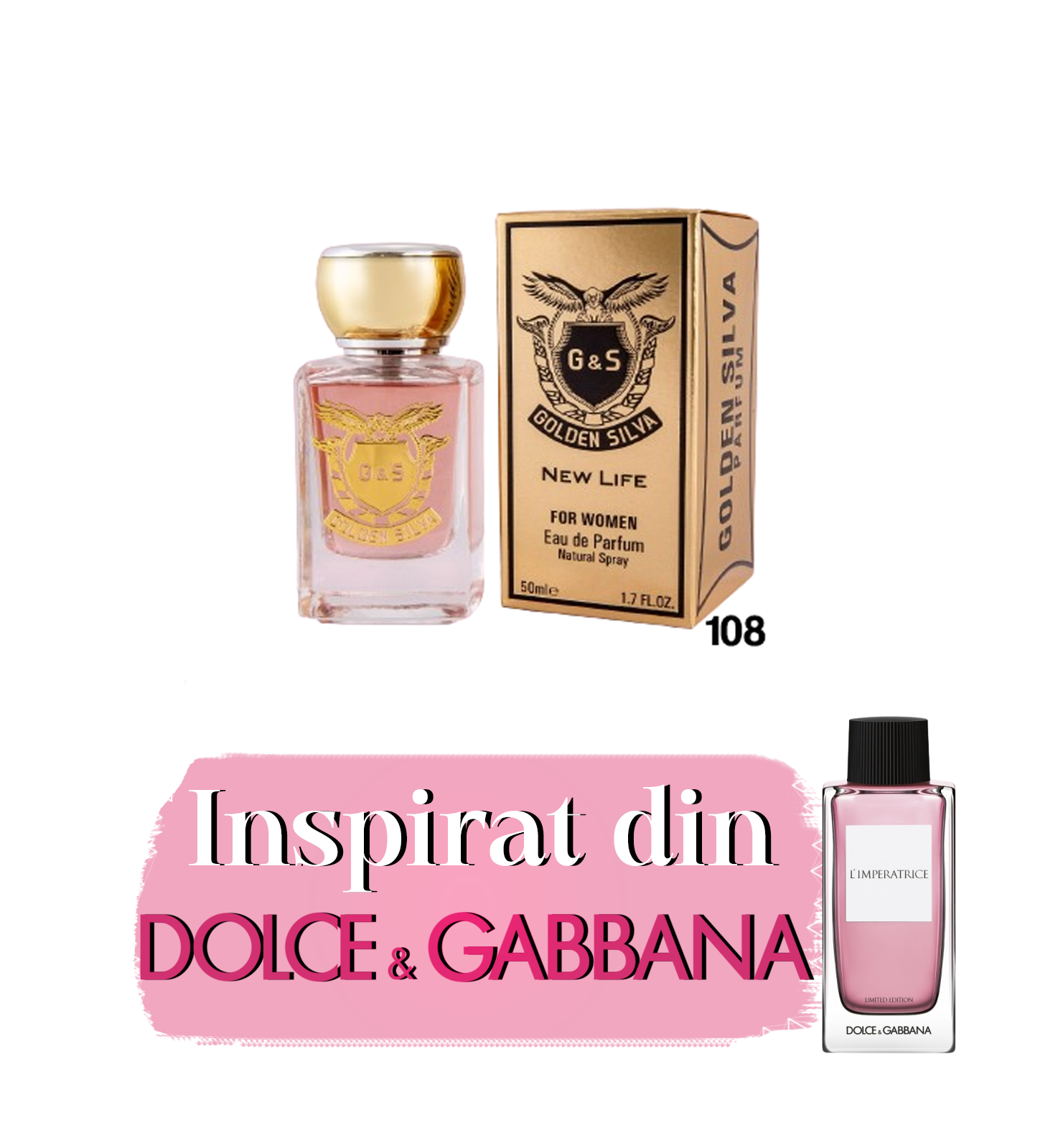 Golden Silva W108 inspirat de L’Imperatrice Limited Edition de Dolce&Gabbana, este un parfum Floral Fructat de dama. Notele de varf sunt pepene rosu si capsuni; notele de mijloc sunt bujor roz, magnolie, trandafir de Damasc si ciclama; Notele de baza sunt mosc, note lemnoase, lemn de santal si fum.