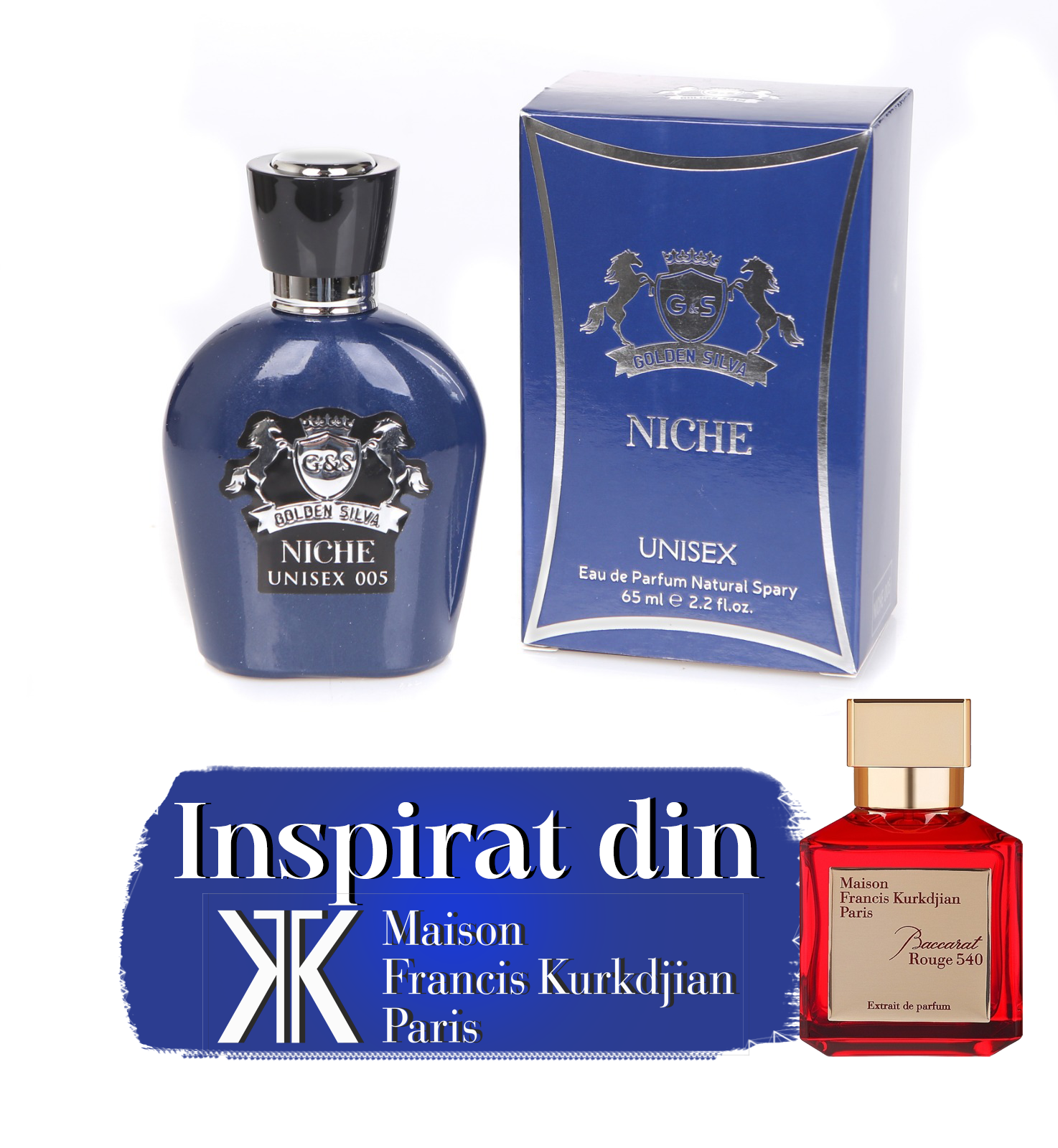 Golden Silva Niche 005 inspirat de Baccarat Rouge 540 Maison Francis Kurkdjian, este un parfum Ambra Floral unisex. Notele de varf sunt sofran si iasomie; notele de mijloc sunt lemn ambrat si Ambergris; Notele de baza sunt rasina de brad si cedru.