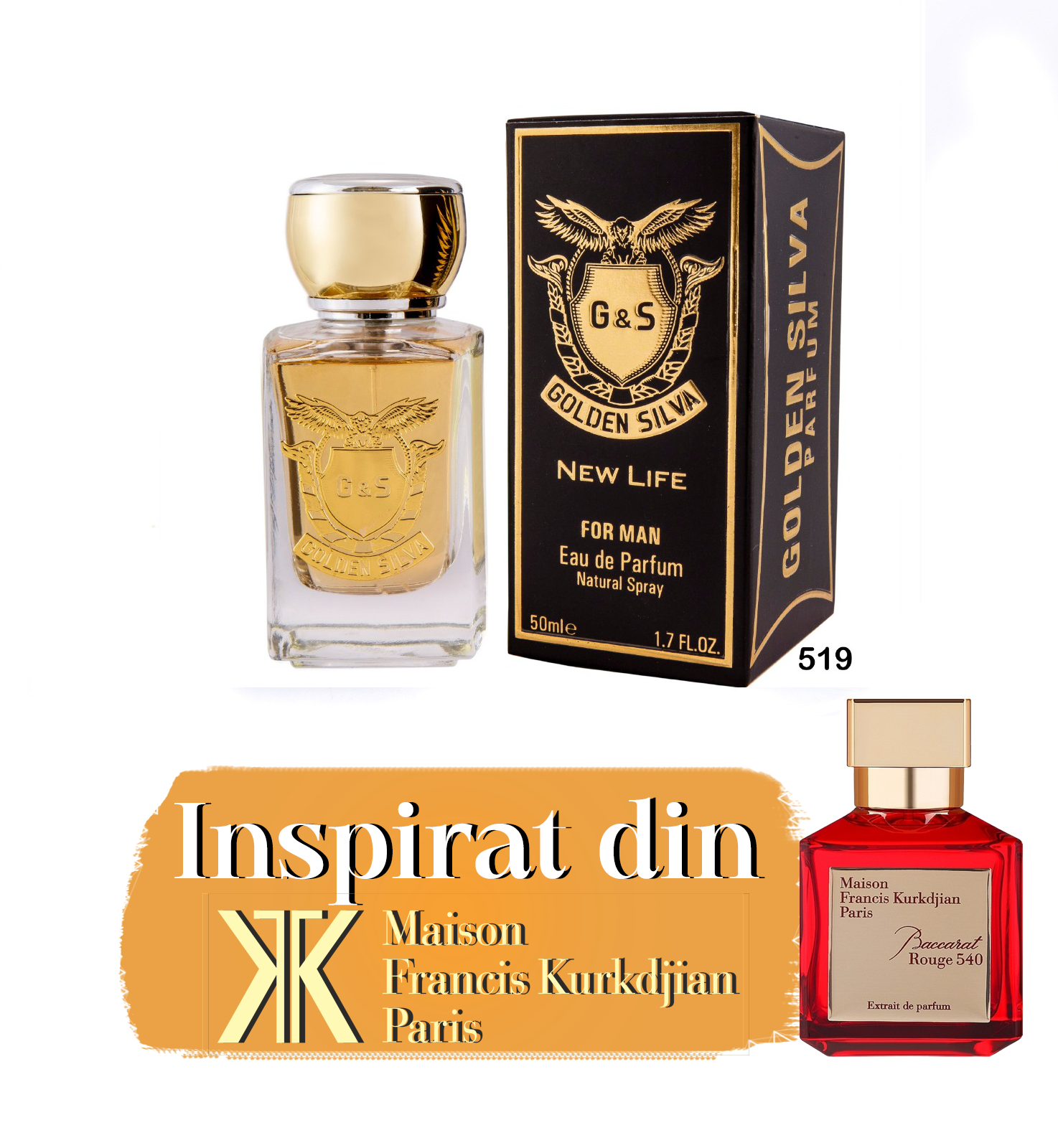 Golden Silva M519 inspirat de Maison Francis Kurkdjian Paris Baccarat Rouge, este un parfum Ambra Floral unisex. Notele de varf sunt sofran si iasomie; notele de mijloc sunt lemn ambrat si Ambergris; Notele de baza sunt rasina de brad si cedru.